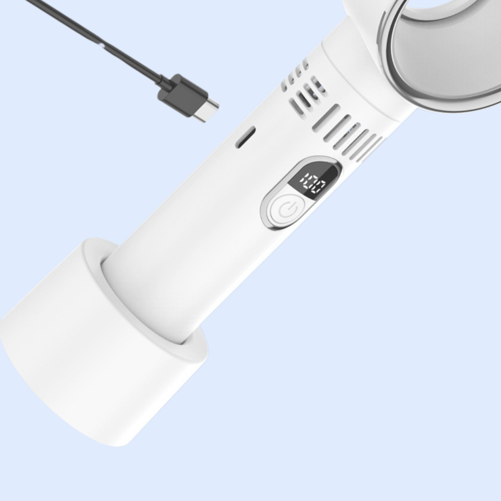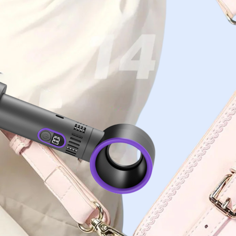 持ち運びに便利なブレードレスファン。安全設計で静音、USB充電式。軽量コンパクトで外出先やオフィスに最適。